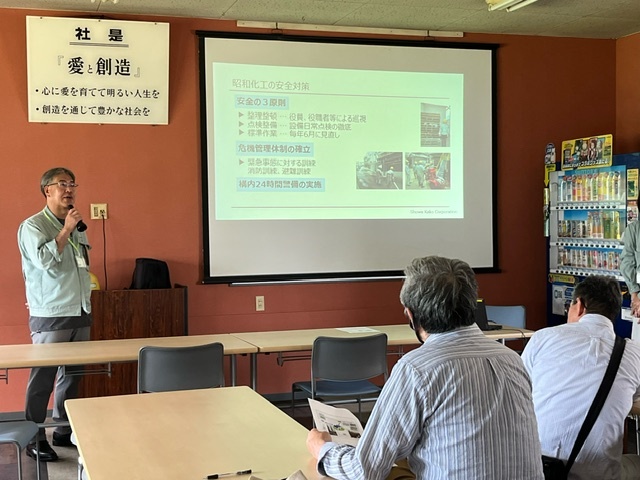 この交流会は、弊社工場で何をどのように製造していて、その過程でどのように環境負荷の低減や関連法令の順守に取り組んでいるのか、
