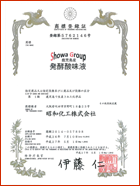 『品質の安心・安定を更に向上する為に、WAC、食添GMP、ISO9001、ISO14000に次ぎ、ISO22000を取得しました。更なる品質の安心・安定供給を目指して参ります。グループ会社の九州化工・サツマ化工も、ISO22000を来期中の取得に向けてプロジェクトを立上ました。我々昭和グループとして皆さんに安心・安定供給を目指して参ります。』