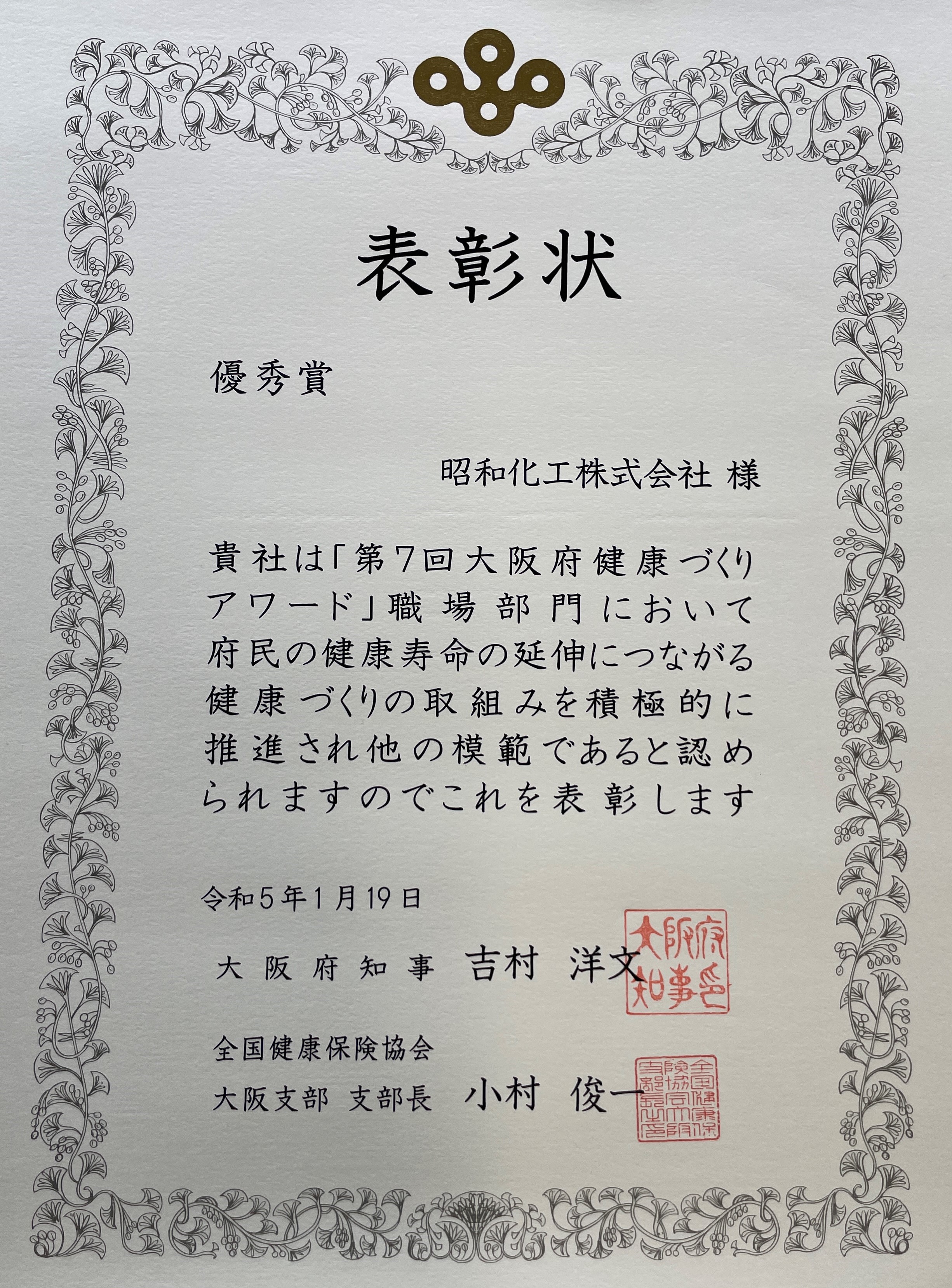 大阪府他の主催する「第7回大阪府健康づくりアワード」において「職場部門優秀賞」を受賞しま
