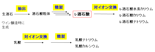 昭和化工㈱では日本国内で唯一天然物からL-酒石酸を製造しています。原料にワイン醸造時に生成する生酒石を用い、独自の抽出技術により酒石酸粗体を取り出しています。そのままの状態では天然由来の金属分が多量に含まれているため、酸・アルカリを適切に組み合わせて溶解・ろ過を繰り返すことにより精製していきます。こうして得られた酒石酸はそのままで製品としてお客様に提供されるほか、さらに対イオン交換を行うことにより各種塩類への誘導も行っています。この対イオン交換技術を活用し、高純度の乳酸塩の製造も行っています。
