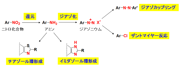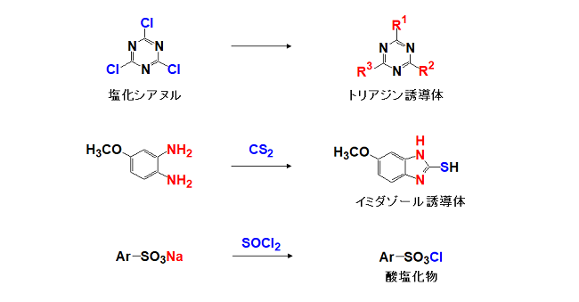 下記の物質を原料・副原料とした製造を行っていることも大きな特徴です。塩化シアヌルからは芳香族求核置換反応によるトリアジン誘導体の合成、二硫化炭素 (CS2) からのイミダゾール誘導体の合成、また塩化チオニル (SOCl2) を用いた酸塩化物の製造などが可能です。