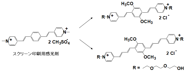 産学共同でスクリーン印刷用感光剤の合成技術を用いて新規の蛍光物質の研究を行っています。これらの化合物は水溶性が高いことが大きな特徴であり、生体の染色を目的として開発されました。成果は学術論文 [1] および特許 [2] として発表しています。