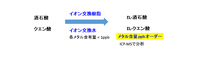 精密電子産業に用いられる材料には極めて高い純度が求められ、そのレベルも年々高まっています。昭和化工㈱では半導体製造時の洗浄剤として利用される EL-有機酸の製造を行っています。酒石酸やクエン酸などのキレート作用による金属捕集が鍵となっています。精密電子産業に用いるには含まれているメタルの量に厳しい基準が設けられています。これに対応するために弊社では3基のイオン交換水製造装置を設置し、イオン交換樹脂を用いて不要なメタルを除いています。技術もさることながら、原料となる有機酸を独自に製造できることが大きな強みでもあります。